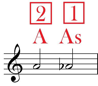 Esimeses näites on A-noodile (3. keel 2. vahe) pandud bemoll. Bemoll muutis noodi poole tooni võrra ehk ühe vahe võrra madalamaks. Nüüd on noodi nimi As (ehk bemolliga A) ja see asub 3. keelel 1. vahes.